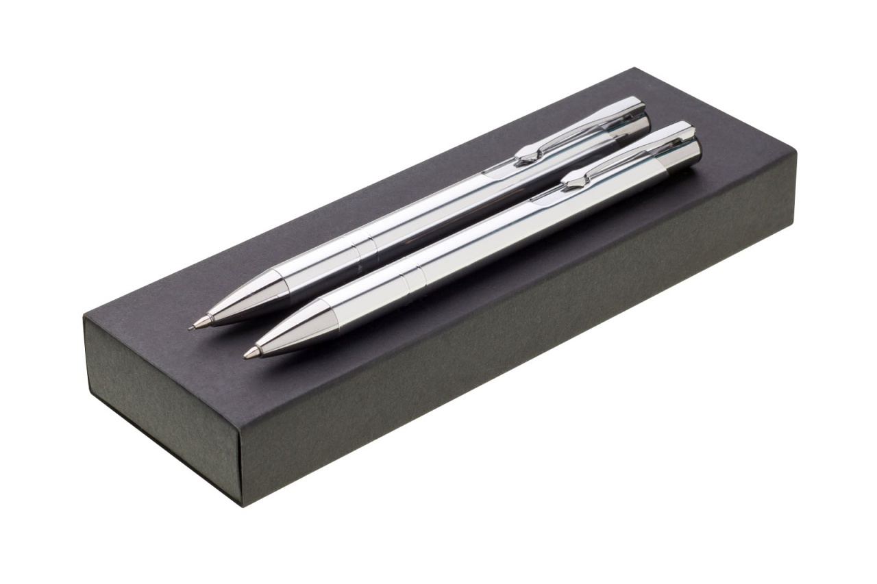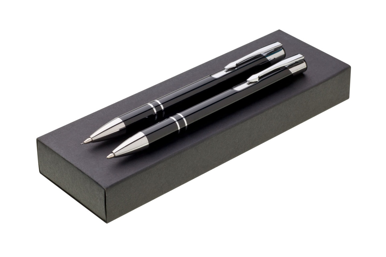 Set de pixuri ADO™ ORIN din aluminiu cu finisaj premium și dungi argintii, ideal pentru campanii promotionale B2B. Venit în cutie de hârtie neagră, perfect pentru cadouri corporative și branding personalizat.
