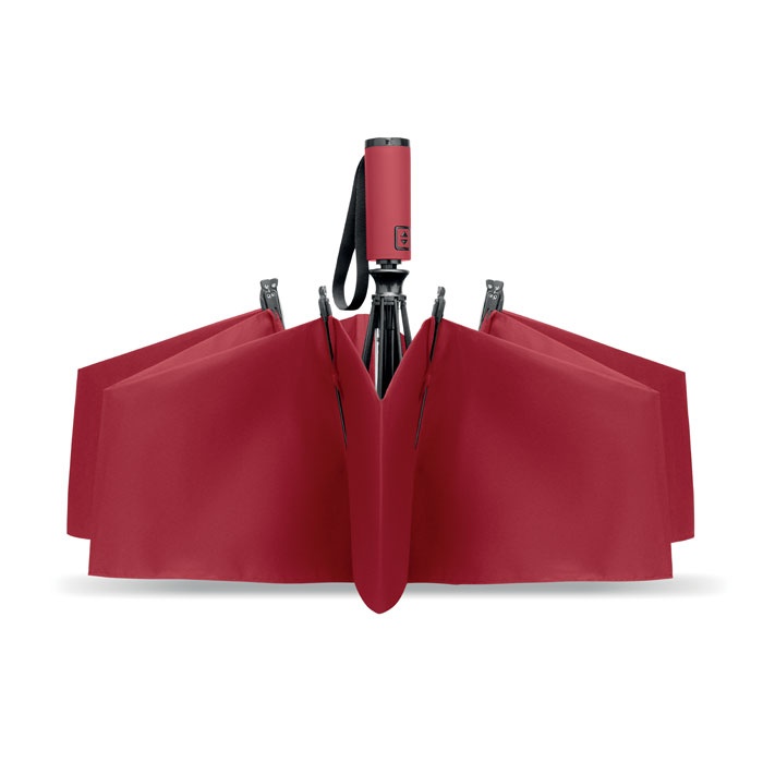 23-inch 3-fold reverse windproof umbrella made of 190T RPET pongee and matching pouch. Auto open and close, full black plating frame, fibreglass ribs, and a rubber-finished ABS handle.