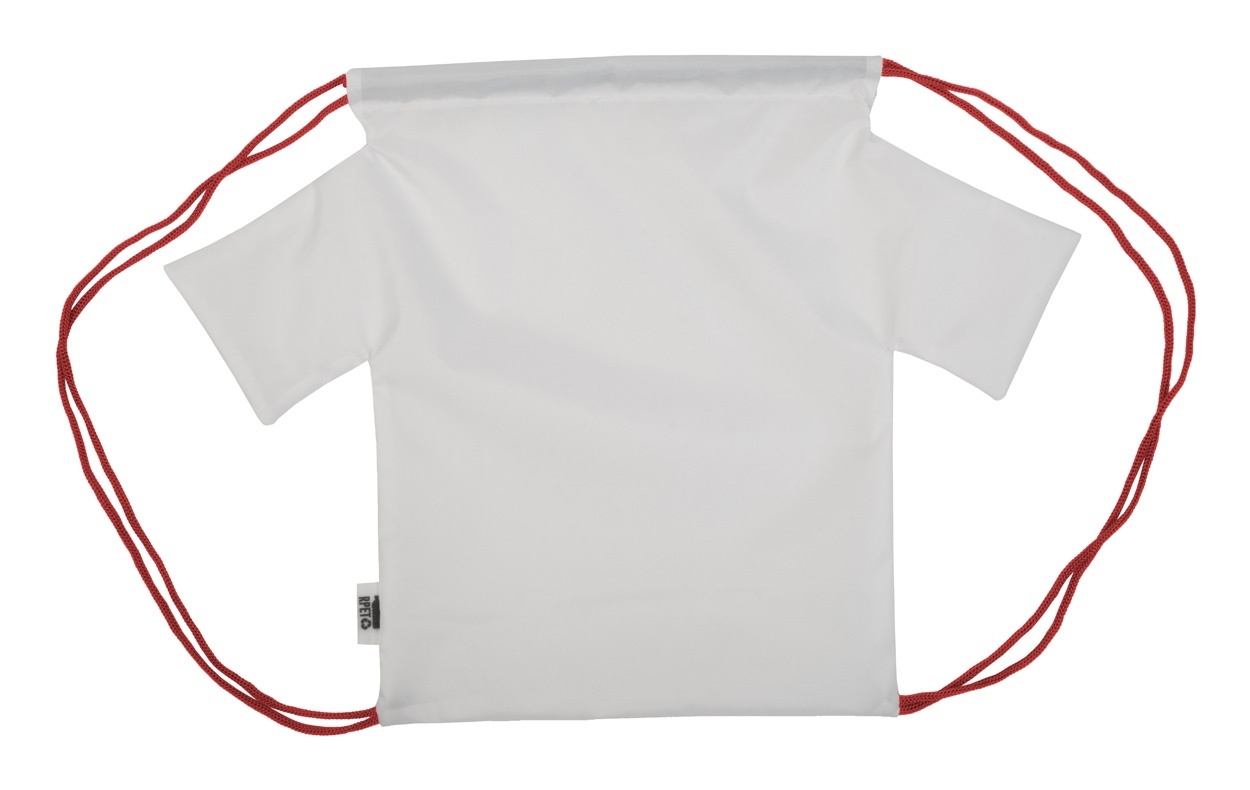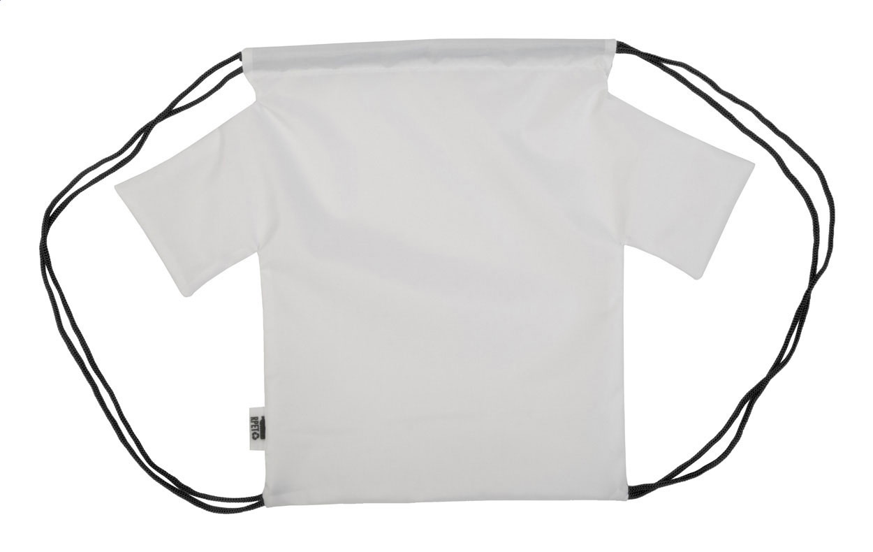 | Rucsac personalizat, cu șnur, în formă de tricou, din poliester RPET 190T. Cu grafică imprimată prin sublimare și etichetă RPET distinctivă. MOQ: 25 buc.