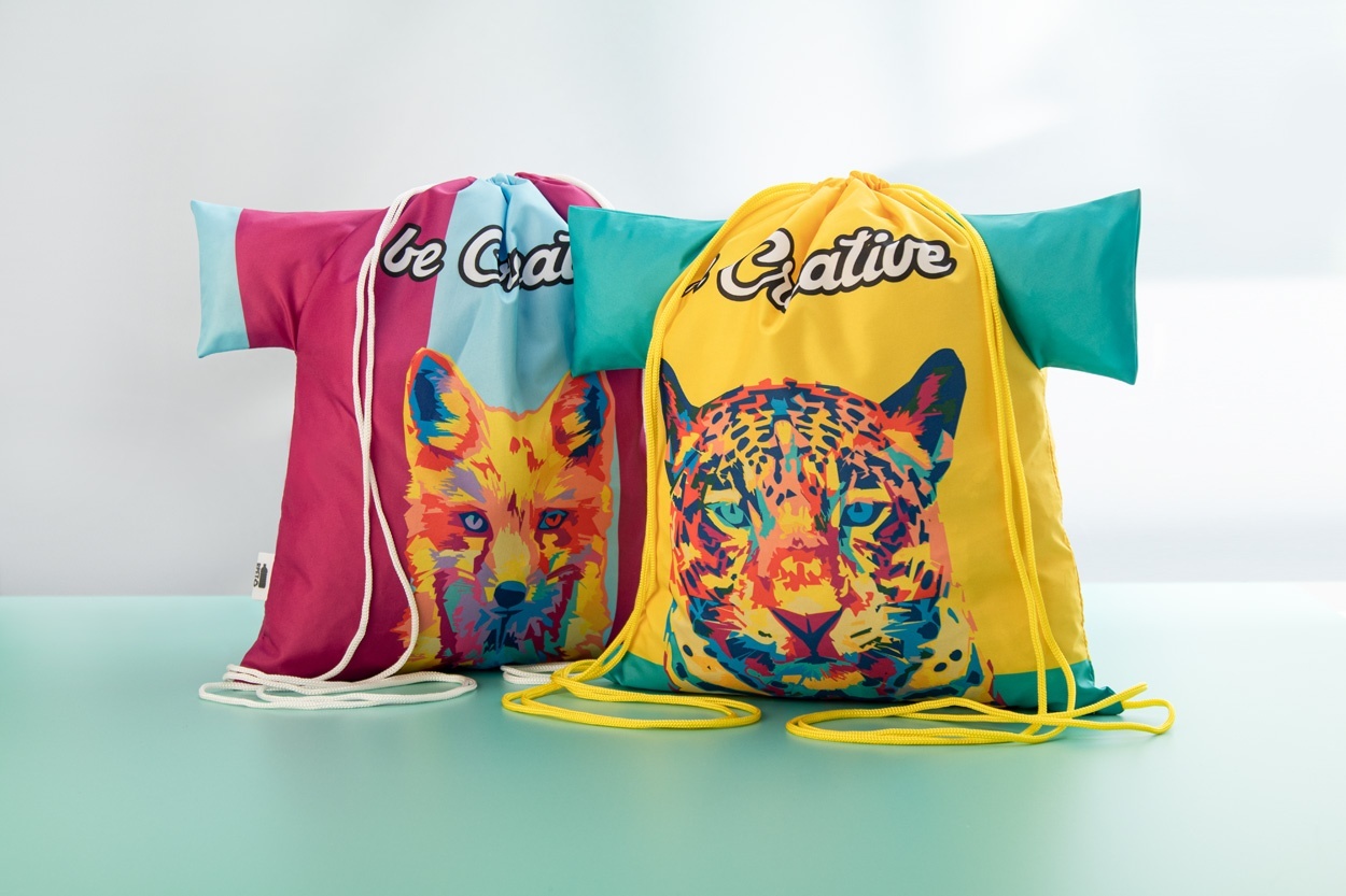 Custom made, T-shirt shaped drawstring bag with coloured strings, 190T RPET polyester. With all over sublimation printed graphics and distinctive RPET label. MOQ: 25 pcs.