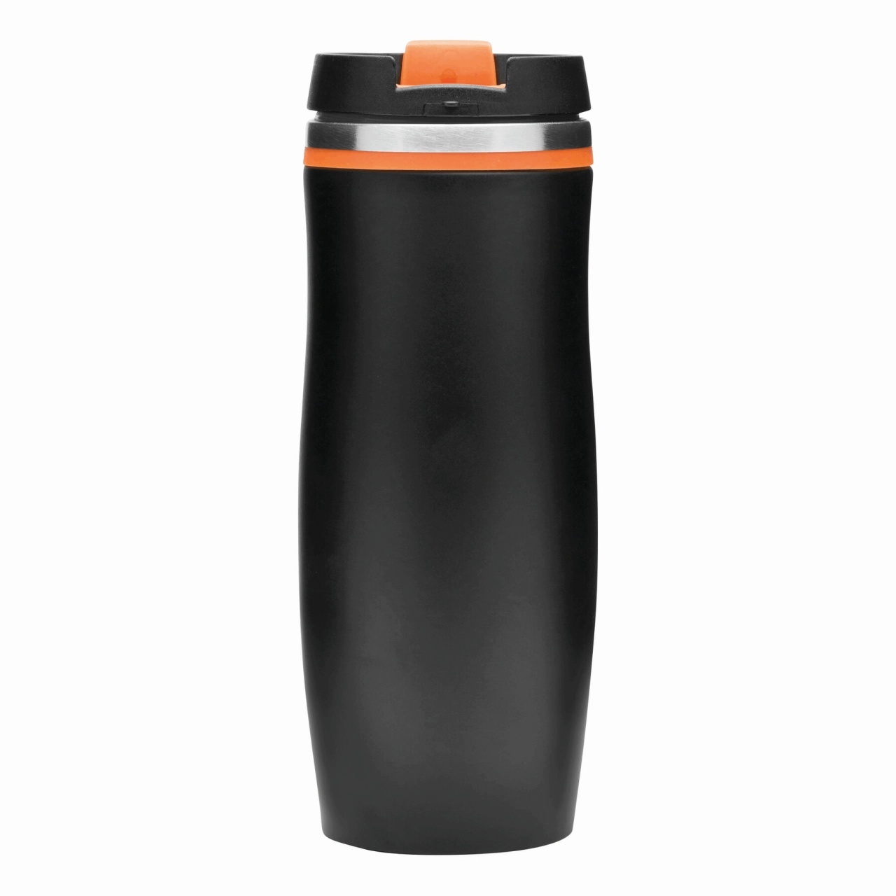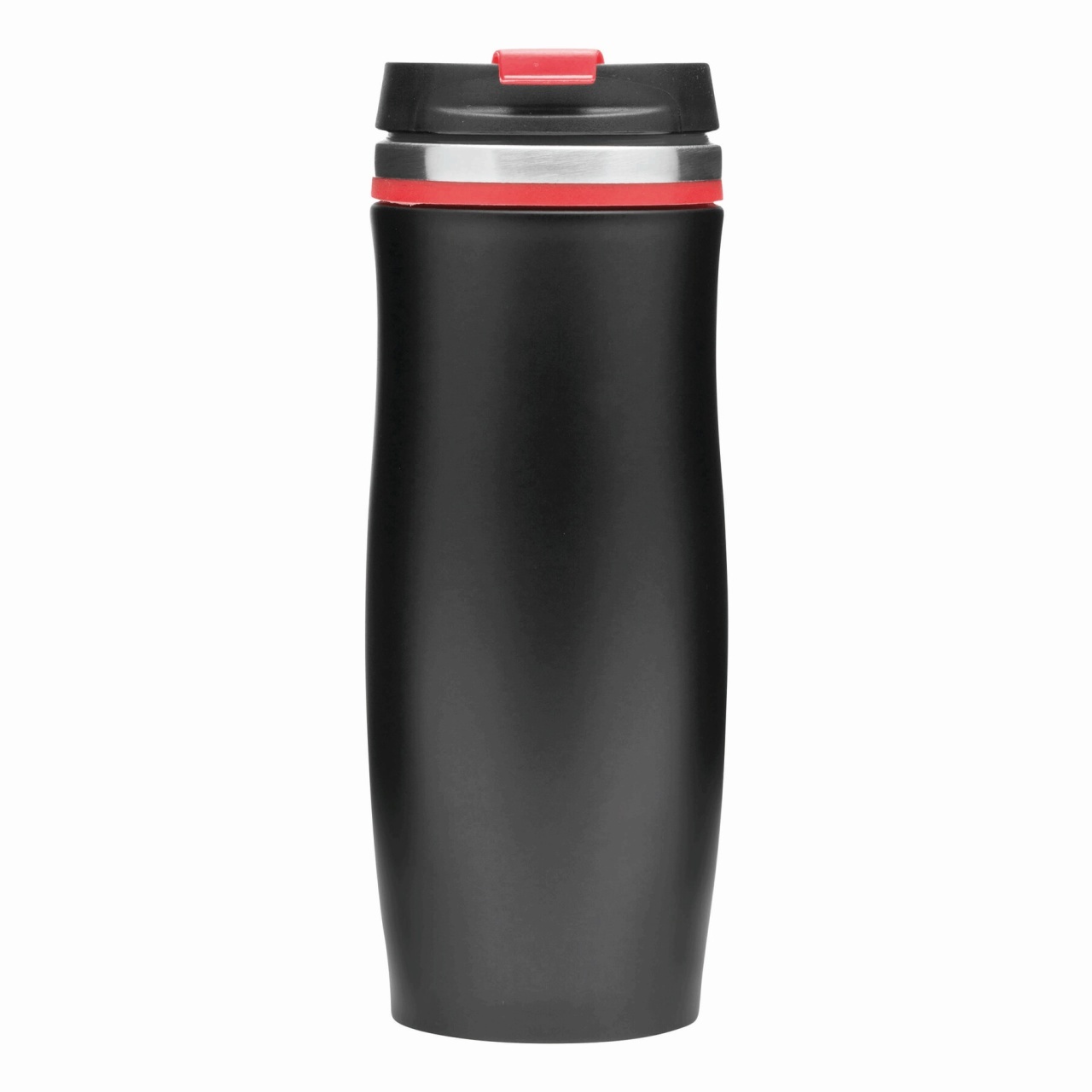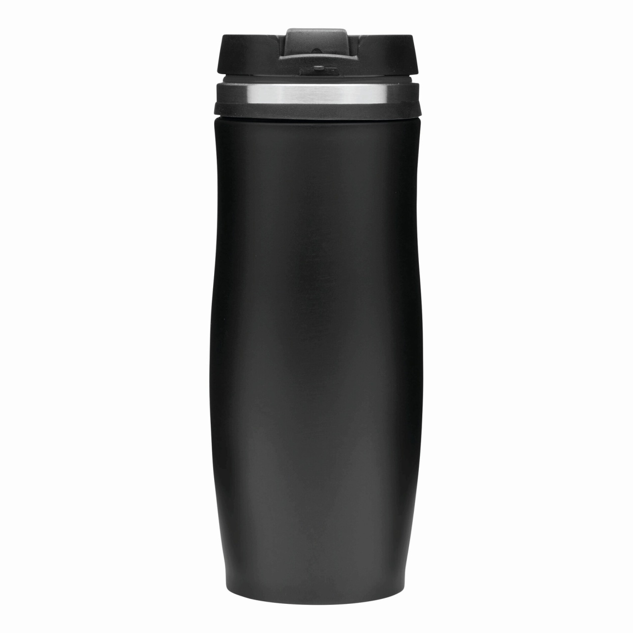 Double-walled travel mug DARK CREMA: inside and outside made of stainless steel, plastic lid with secure screw cap and integrated fold-out drinking opening, coloured rubber ring around the top and rub