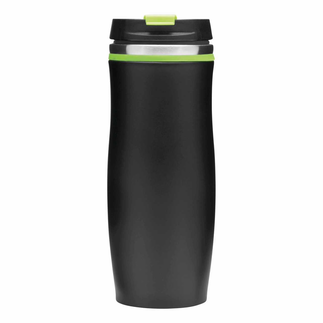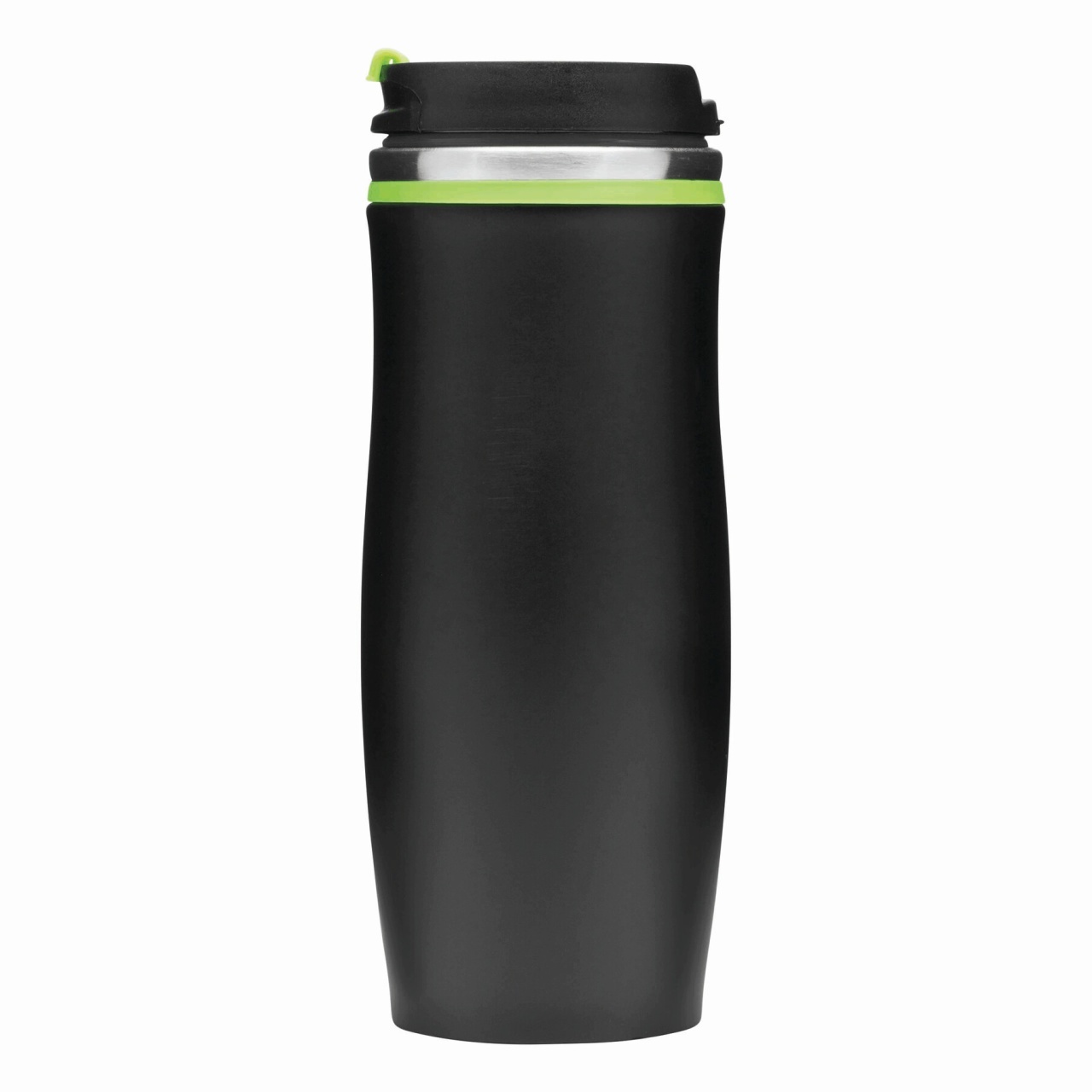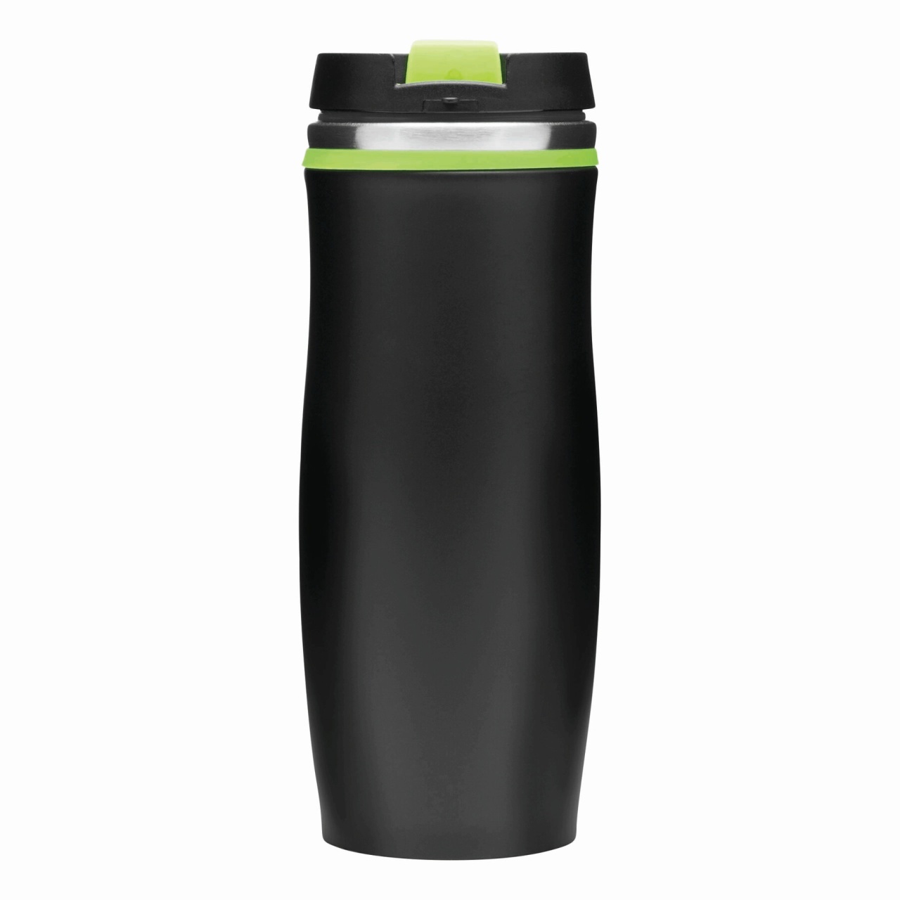 Double-walled travel mug DARK CREMA: inside and outside made of stainless steel, plastic lid with secure screw cap and integrated fold-out drinking opening, coloured rubber ring around the top and rub