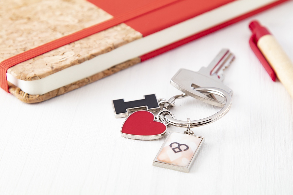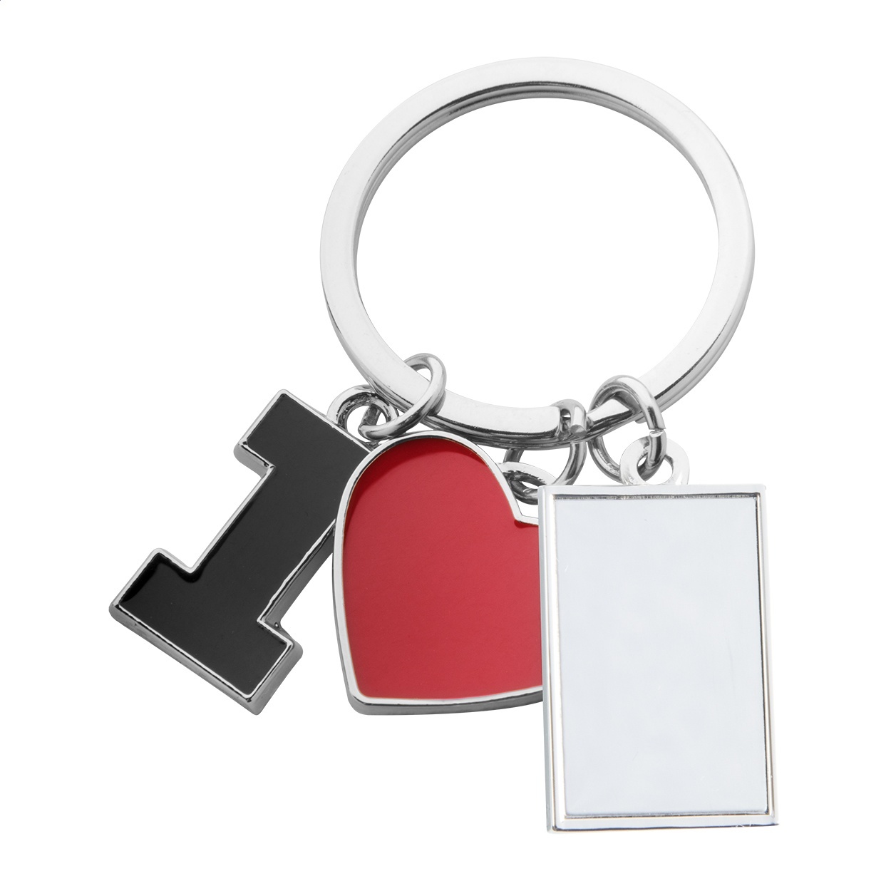 Metal keyring with 3 charms: „I”, heart and a rectangle. In black gift box.