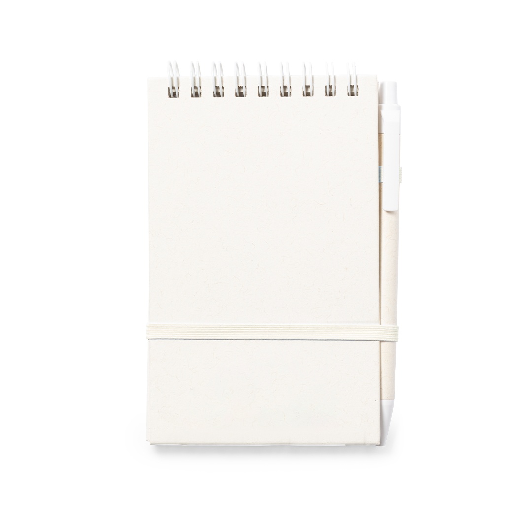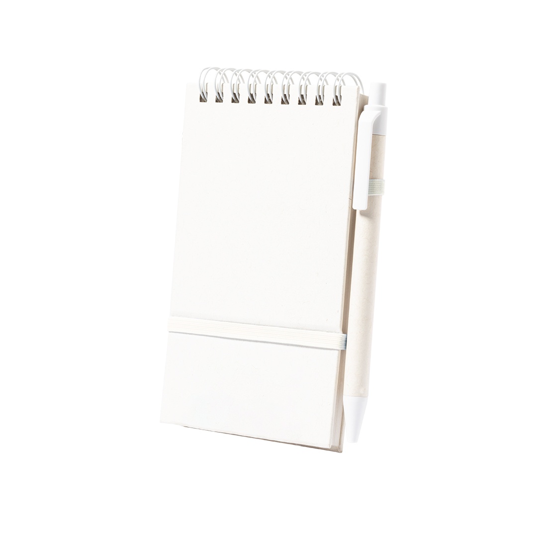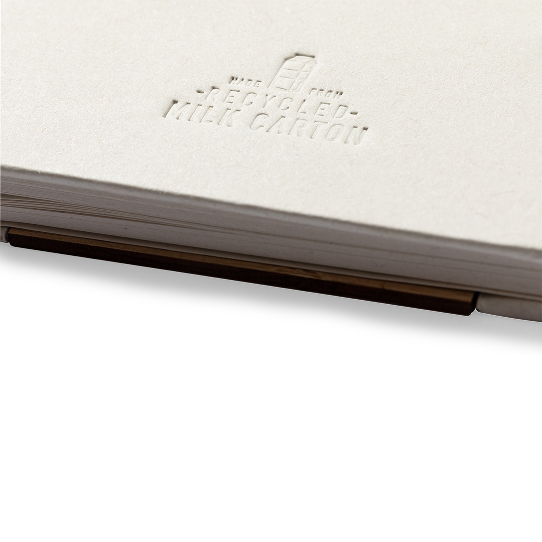 Hard covers notebook made from recycled milk cartons. With 80 sheets of single-stripe layout, matching elastic band and pen holder. Also includes matching ball pen with push-button mechanism and blue ink. With Recycled Milk Carton logo on the corner of each sheet, at the back cover and on the ball pen. Presented in an individual recycled bag.Milk cartons are mostly made of cardboard and Aluminium. During the recycling process, the different packaging materials are separated for reuse and re-purposing, thus contributing to the infinite path of the circular economy. This material is well known for its high recyclability, as well as for its lightweight and resistance.