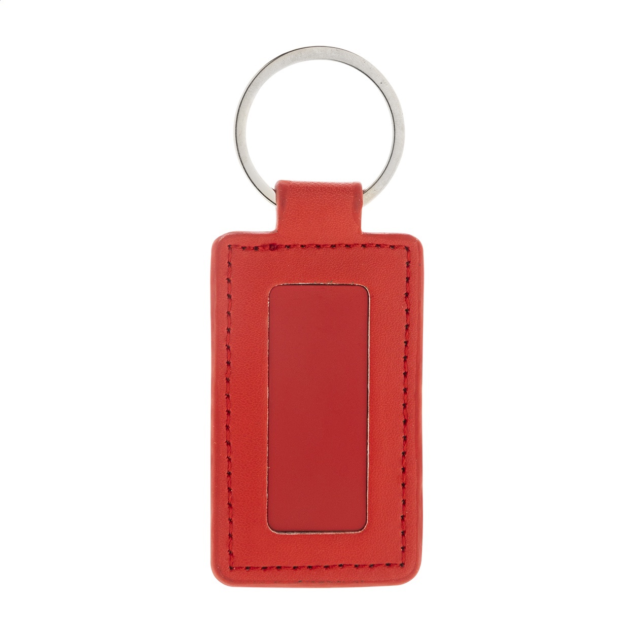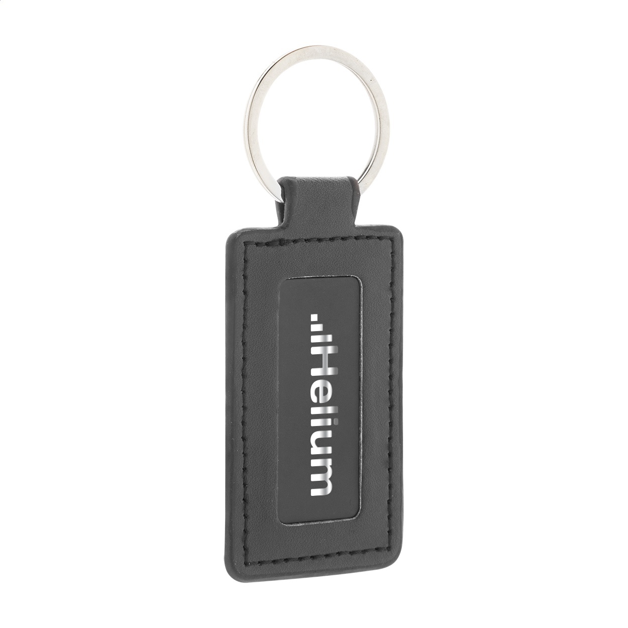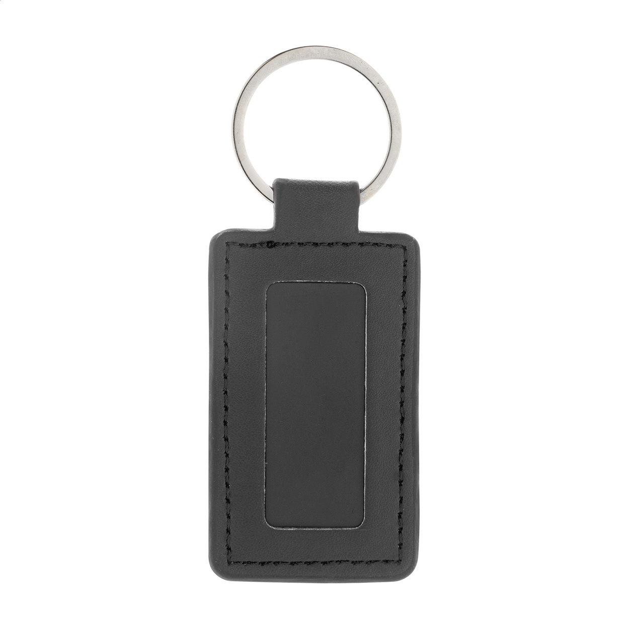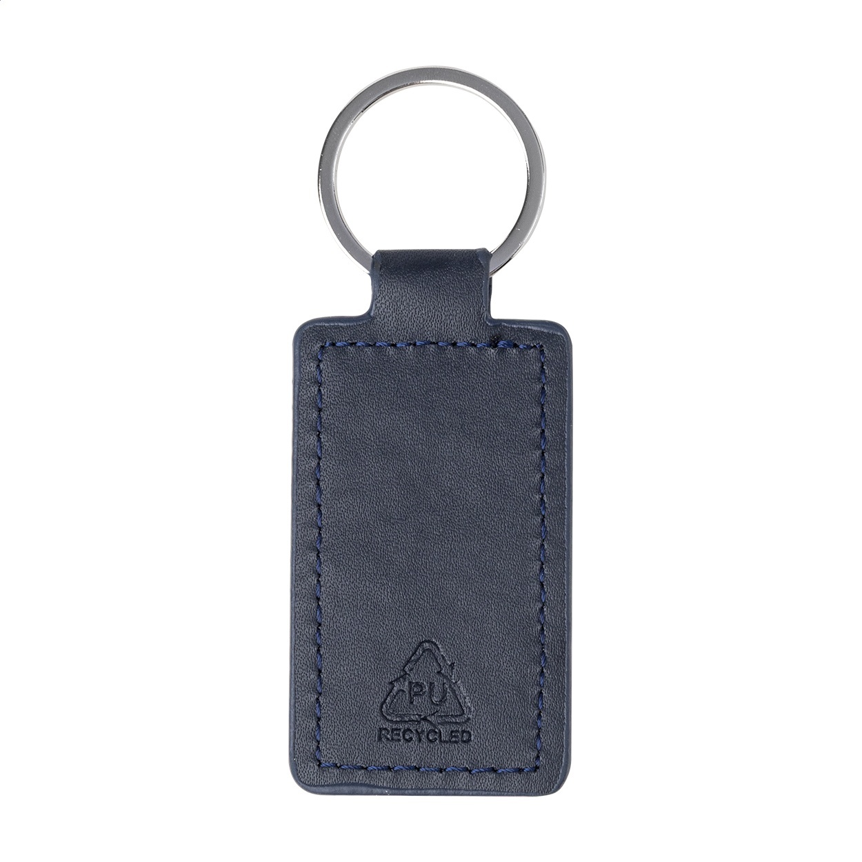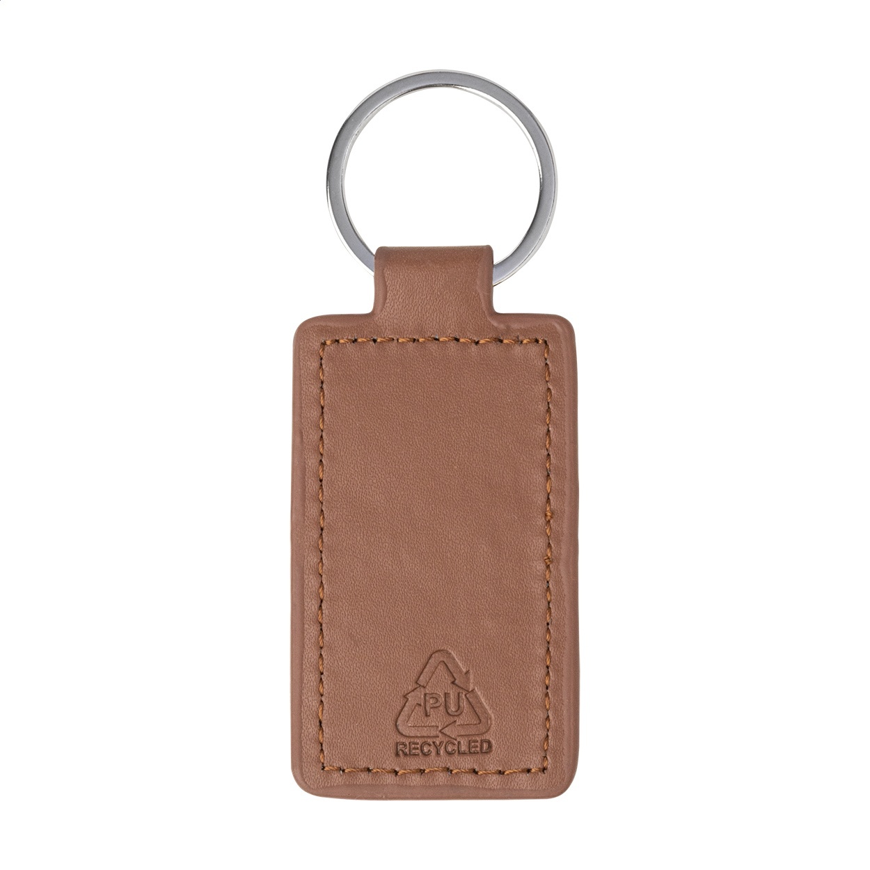 Rectangular shaped, recycled PU leather keyring with metal ring and stainless steel logo plate with rubberized finish. With special coating for mirror laser engraving.