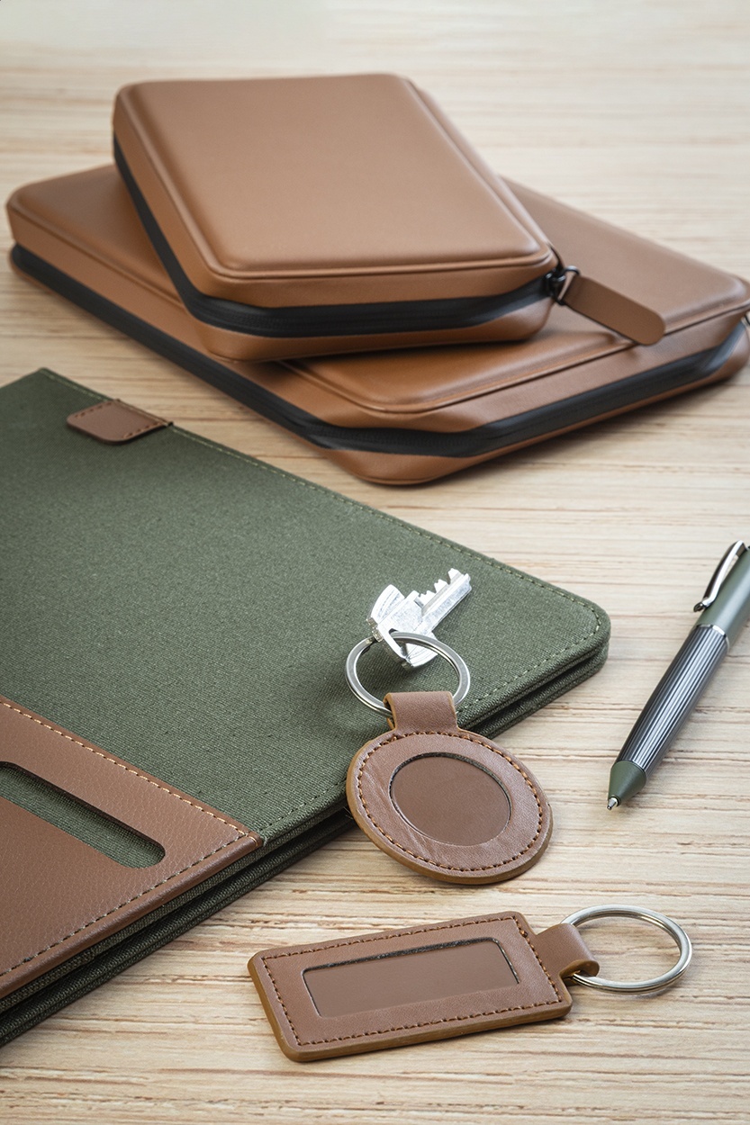 Rectangular shaped, recycled PU leather keyring with metal ring and stainless steel logo plate with rubberized finish. With special coating for mirror laser engraving.| Breloc dreptunghiular, din piel