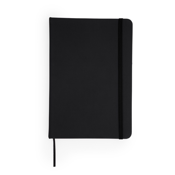 | A6 notepad with rigid leatherette covers. Bookmark and elastic band. 100 sheets.