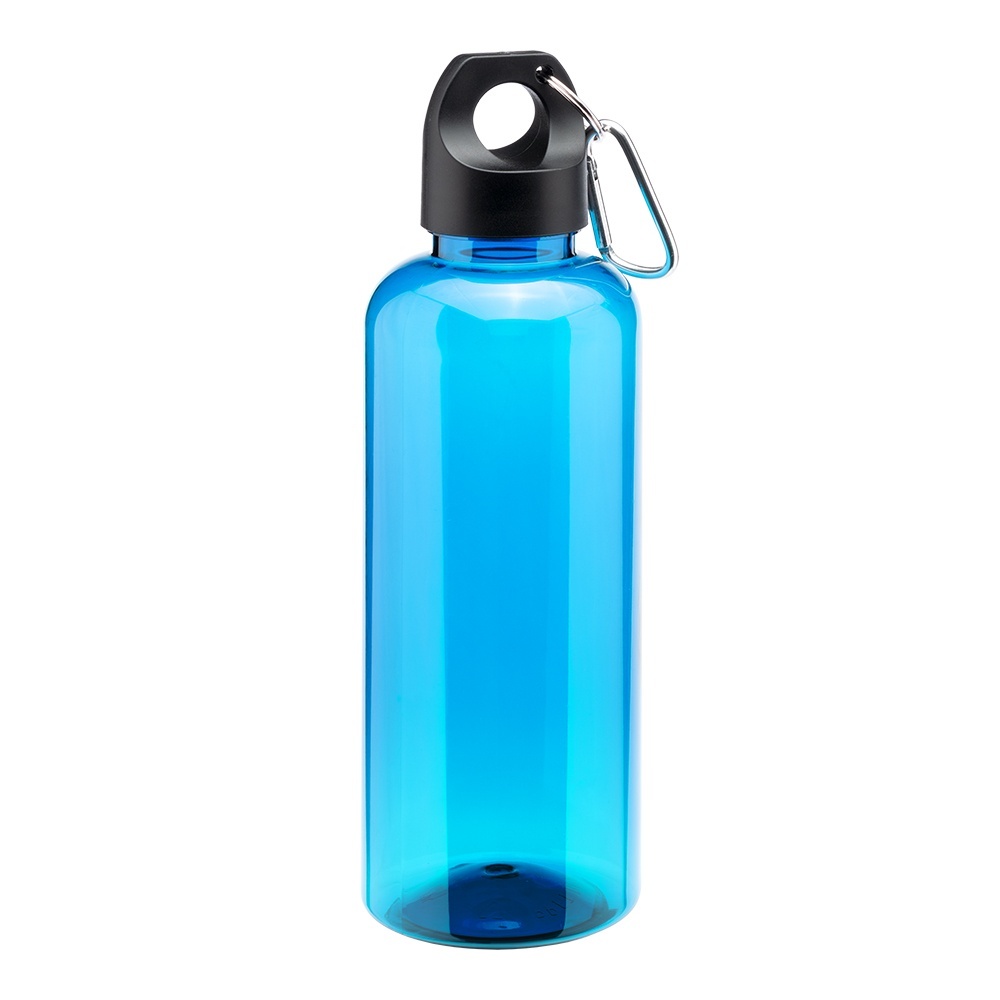 Transparent bottle in recycled PET 580 ml. Plastic cap with carabiner