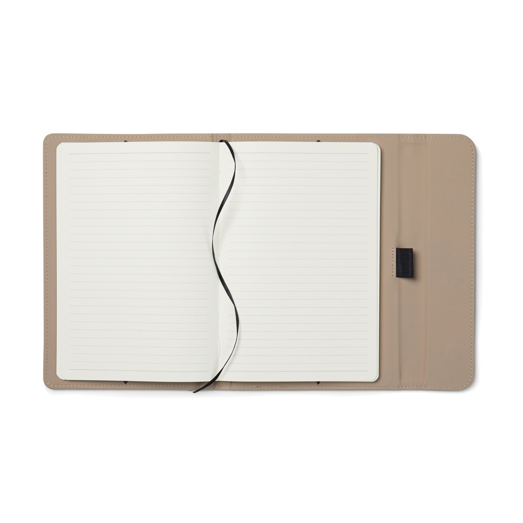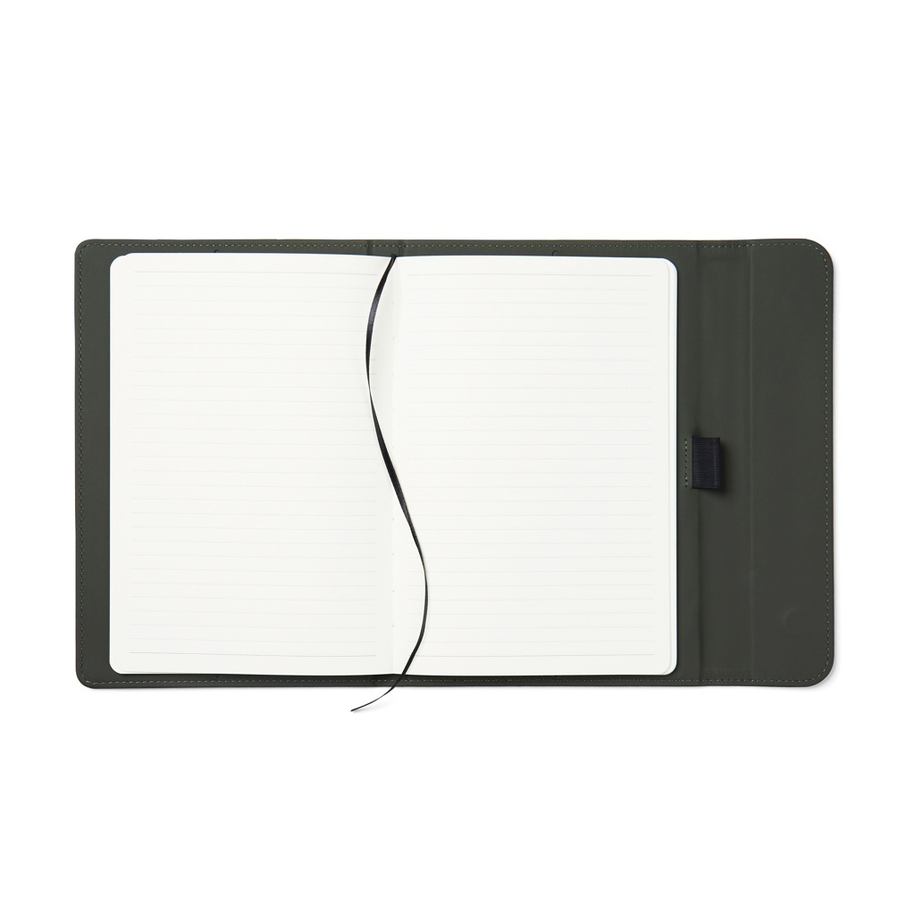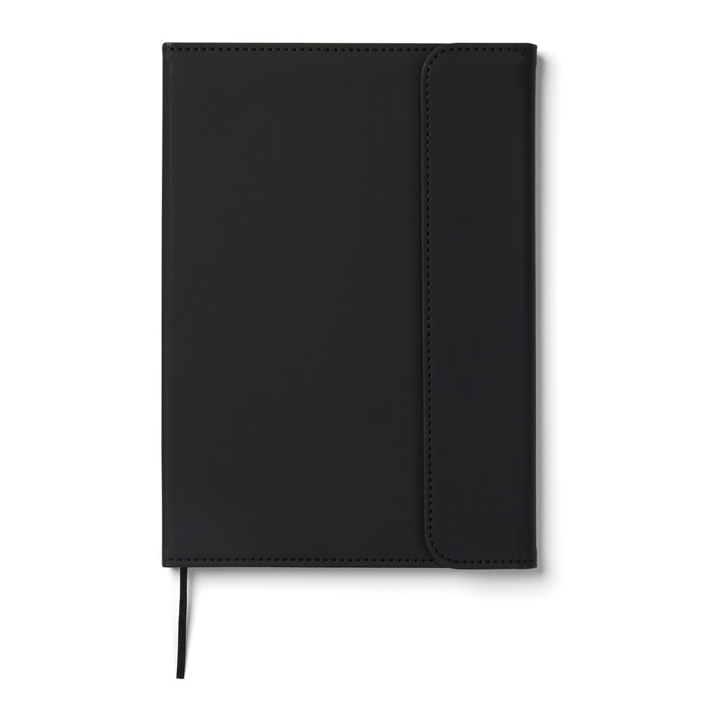 | Caiet A5 elegant, cu o textură fină la atingere. Coperta sa, fabricată din 30% PU mat reciclat, are o închidere magnetică și un suport integrat pentru pix. În interior, se află 80 de coli/160 de pagini de hârtie reciclată liniată de 70 g/m², potrivită pentru toate nevoile tale de notițe.