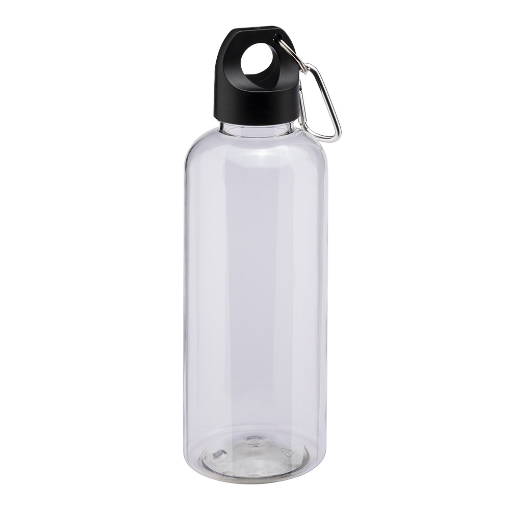 Sticlă transparentă din PET reciclat 580 ml. Capac de plastic cu carabină.